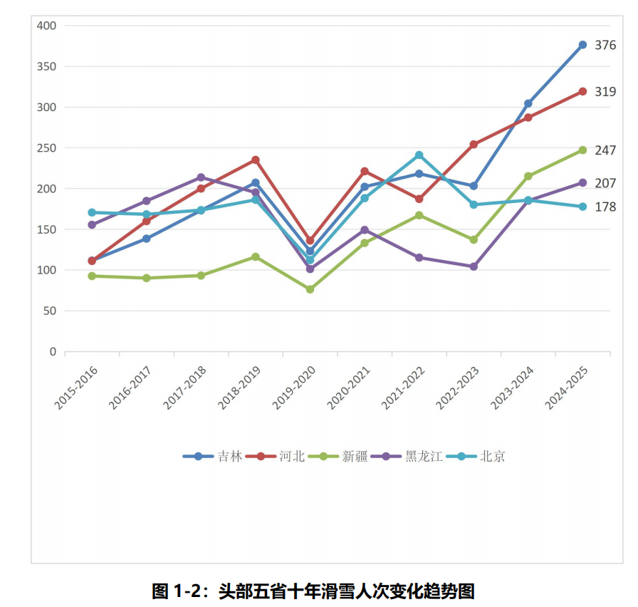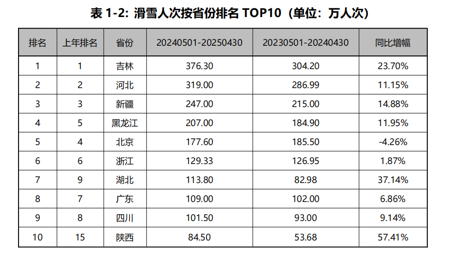 從連續(xù)十年的數(shù)據(jù)來(lái)看,吉林、河北、新疆、黑龍江、北京已形成中國(guó)滑雪目的地的頭部五省格局,華北、東北兩大區(qū)的滑雪人次占比均超過(guò)25%,合計(jì)連續(xù)兩年超過(guò)全國(guó)總量的一半。