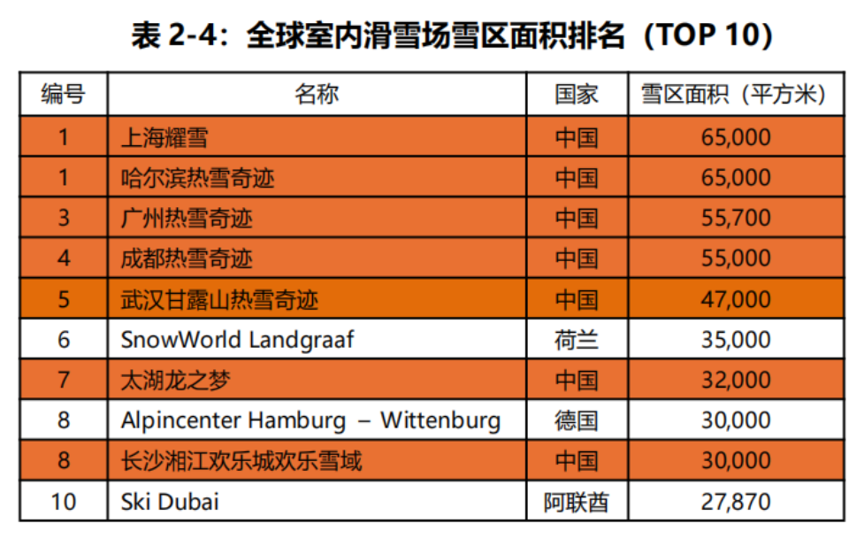 在國(guó)際對(duì)比中,中國(guó)已成為室內(nèi)滑雪場(chǎng)的絕對(duì)領(lǐng)跑者。全球雪區(qū)面積排名前十的室內(nèi)滑雪場(chǎng)中,中國(guó)占據(jù)七席,且前五名全部位于國(guó)內(nèi),其中上海耀雪、哈爾濱熱雪奇跡面積最大,超過(guò)6萬(wàn)m²。隨著深圳、長(zhǎng)春等新項(xiàng)目的投入運(yùn)營(yíng),中國(guó)在室內(nèi)滑雪場(chǎng)全球前十中的占比預(yù)計(jì)將達(dá)到九席。