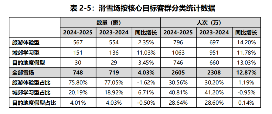 具體來(lái)看,旅游體驗(yàn)型雪場(chǎng)數(shù)量占比最大,達(dá)到75.8%,成為覆蓋最廣、最普及的雪場(chǎng)類型。城郊學(xué)習(xí)型雪場(chǎng)雖然數(shù)量?jī)H占20.19%,但增速最快,累計(jì)服務(wù)滑雪人次最多,達(dá)到1063萬(wàn),在培養(yǎng)初級(jí)滑雪用戶和普及滑雪運(yùn)動(dòng)方面發(fā)揮著重要作用。符合目的地度假型特征的雪場(chǎng)共有30家,比上年增加1家,但滑雪人次增長(zhǎng)了13.03%,共創(chuàng)造746萬(wàn)滑雪人次,占全國(guó)總?cè)舜蔚?8.64%。雖然數(shù)量?jī)H占4%,但貢獻(xiàn)了近三分之一的滑雪人次,其中吉林“三萬(wàn)一湖”滑雪度假區(qū)、新疆阿勒泰三大雪場(chǎng)以及河北崇禮集群,已成為國(guó)內(nèi)度假型雪場(chǎng)的典型代表。據(jù)新華社報(bào)道,去年進(jìn)入11月后,可可托海國(guó)際雪場(chǎng)日均游客量超過(guò)2000人,其中90%的游客來(lái)自外省,顯示出目的地度假型雪場(chǎng)在吸引深度滑雪消費(fèi)群體和帶動(dòng)消費(fèi)方面具有極強(qiáng)的拉動(dòng)力。