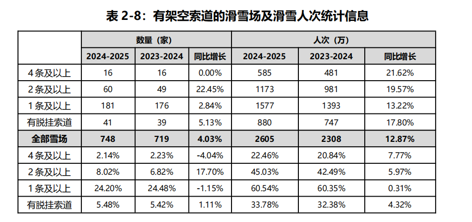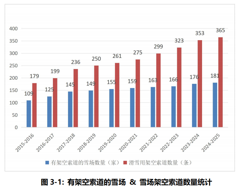 從數(shù)據(jù)來(lái)看,2024-2025雪季財(cái)年,全國(guó)新增12條滑雪架空索道,使得投入運(yùn)營(yíng)的架空索道總數(shù)達(dá)到365條,分布在181家雪場(chǎng)之中;同期新增魔毯170條,有效補(bǔ)充了初學(xué)者和兒童滑雪需求。值得注意的是,國(guó)內(nèi)脫掛式索道發(fā)展加快,國(guó)產(chǎn)索道數(shù)量已達(dá)67條,已遠(yuǎn)遠(yuǎn)超過(guò)進(jìn)口索道數(shù)量。