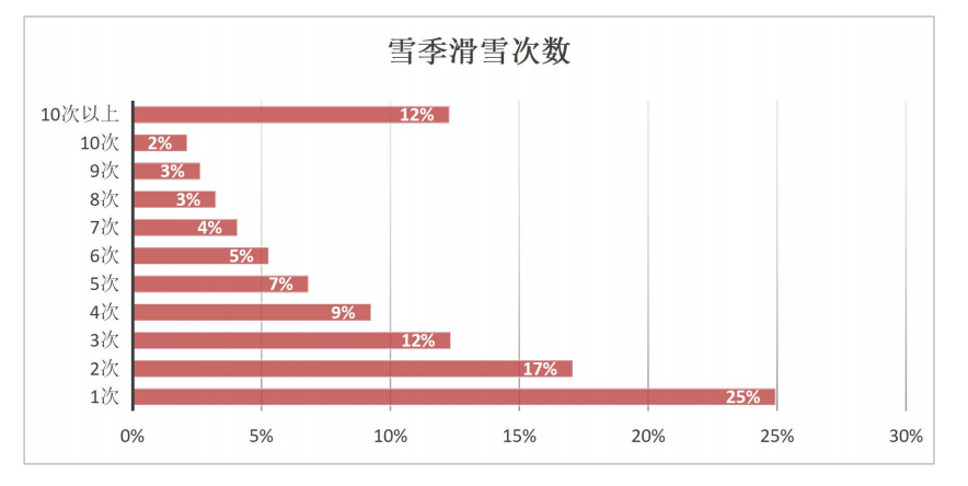 根據(jù)滑唄數(shù)據(jù),在雪季滑雪次數(shù)上,低頻用戶仍占據(jù)主體,25%的用戶每季只滑一次,17%的用戶滑兩次,合計(jì)超過(guò)四成,顯示出滑雪對(duì)大量消費(fèi)者而言仍是一種體驗(yàn)型消費(fèi)。而每季滑3–5次的群體占比約28%,構(gòu)成了從初學(xué)向進(jìn)階過(guò)渡的中堅(jiān)層。核心用戶雖然數(shù)量有限,但依然具備市場(chǎng)支撐力,約30%的滑雪者每季滑雪超過(guò)6次,其中12%的用戶超過(guò)10次,體現(xiàn)出穩(wěn)定的消費(fèi)黏性。