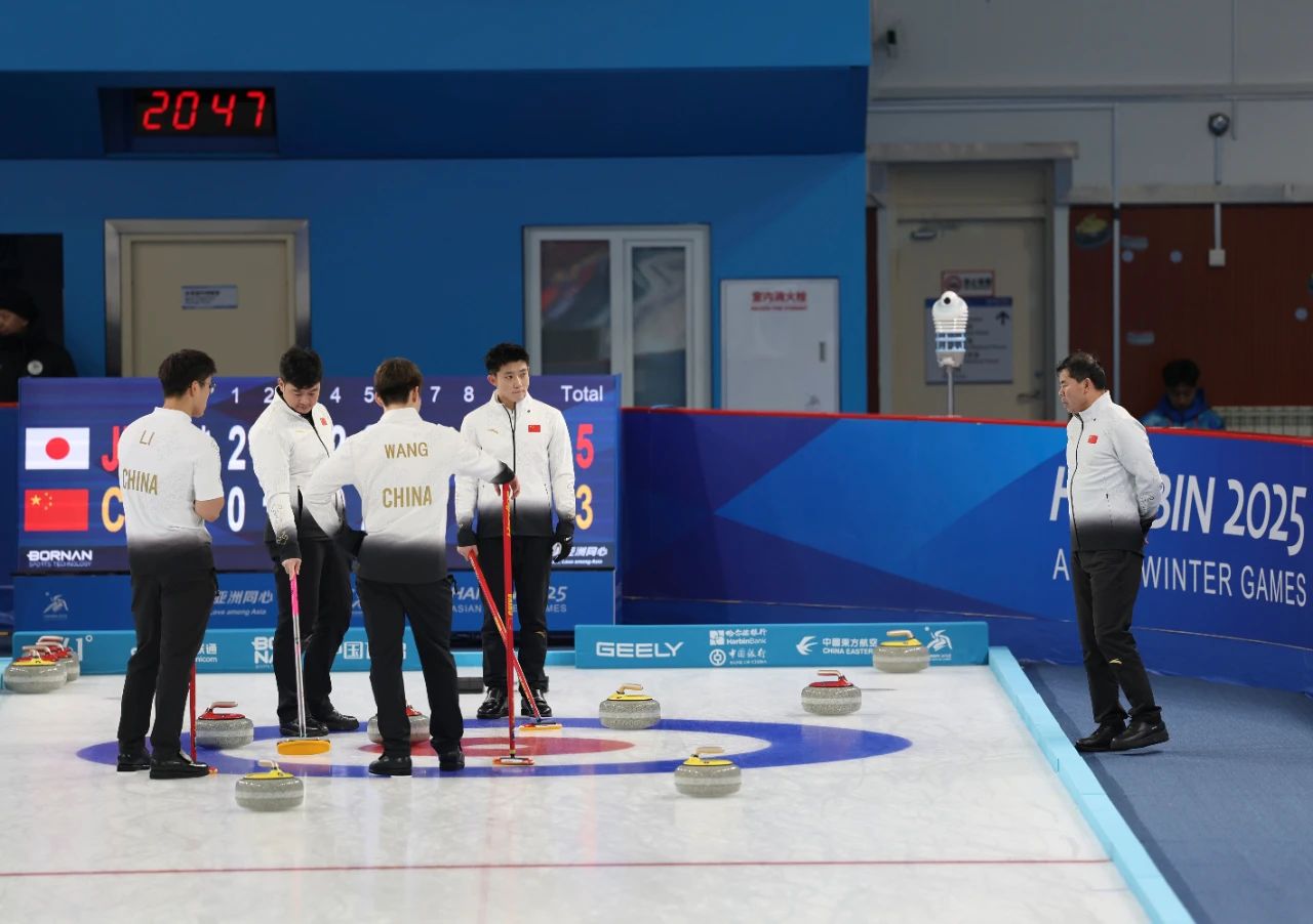 哈爾濱亞冬會男子冰壺循環(huán)賽在2月12日迎來了中國隊(duì)對陣日本隊(duì)的比賽,這場比賽前,中國隊(duì)4戰(zhàn)全勝已經(jīng)鎖定B組晉級資格。開賽后由中國隊(duì)執(zhí)黃色壺先進(jìn)行投擲,經(jīng)過系列賽的磨合,隊(duì)員們之間顯得更加默契,大家從賽前熱身階段就保持著頻繁的交流,教練員也在熱身階段走上冰場和隊(duì)員們一起交流部署。